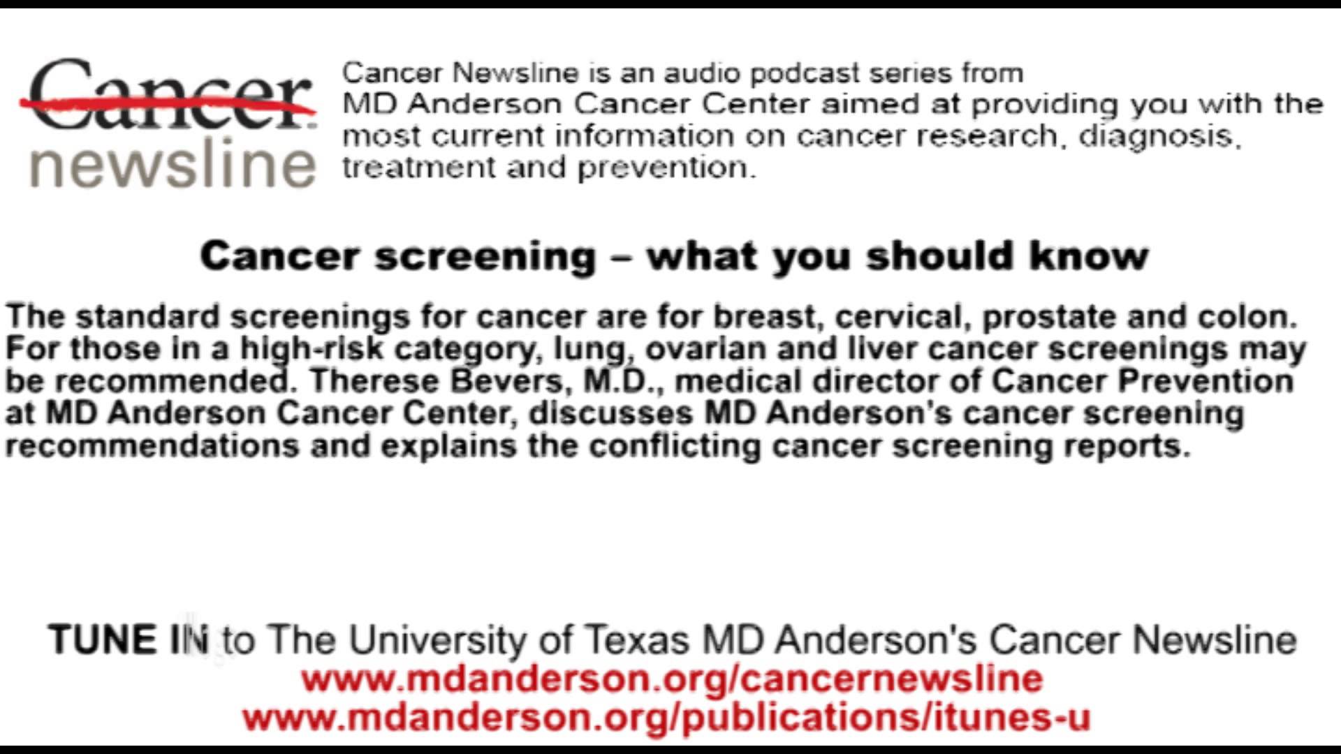 Download from iTunes: https://itunes.apple.com/us/podcast/cancer-screening-what-you/id431848216?i=307417741 The standard screenings for cancer are for breast, cervical, prostate and colon. For those in a high-risk category, lung, ovarian and liver cancer screenings may be recommended. Therese Bevers, M.D., medical director of Cancer Prevention at MD Anderson Cancer Center, discusses MD Anderson’s cancer screening recommendations and explains the conflicting cancer screening reports.