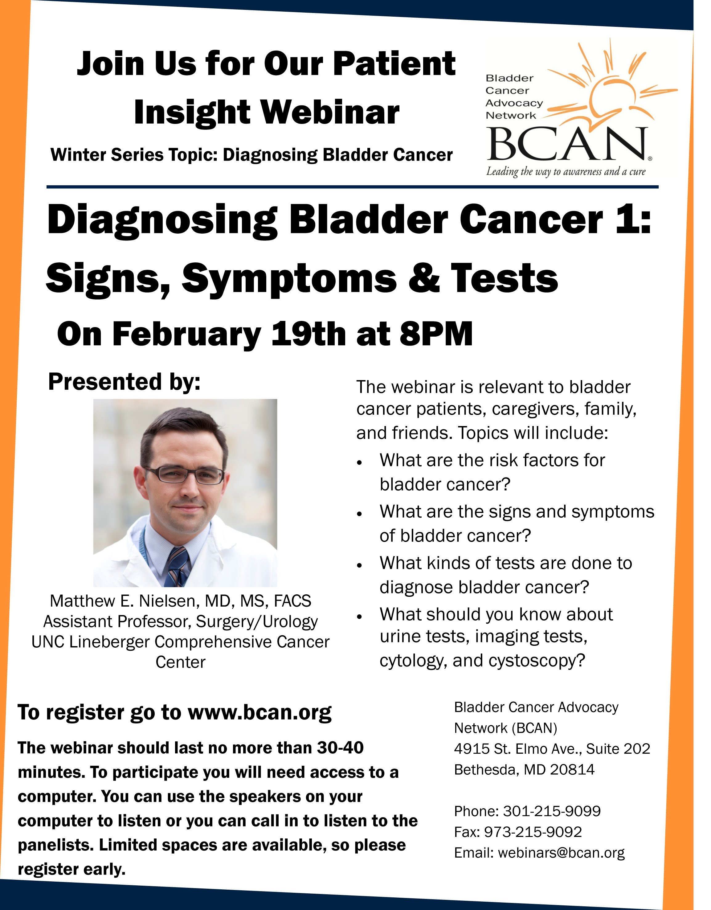This webinar covers risk factors for bladder cancer, signs and symptoms of the disease, and tests used to diagnose bladder cancer such as urine tests, imaging test, cytology and cystoscopy.