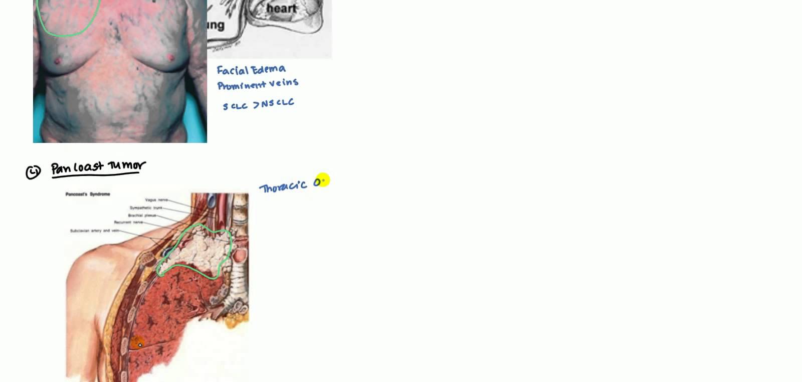Pulmonary Symptoms, most common is cough, Hemoptysis (which ca lead to asphyxia) Chest Pain (dull achy), Dyspnea (secondary to pneumonia, atelectasis, lymphatic tumor spread, pleural effusion and pneumothorax), hoarsenes (when laryngeal nerve involved), pleural effusion (serous, serosangiounous, bloody) which may be caused by metastasis into pleural fluid. Super Vena Cava Syndrome occurs when central tumor invades SVC which causes red, edematous face, prominent veins throughout the body and this is more common in small cell lung cancer. Pancoast tumor is a lung cancer located in the apex of the lungs. Pancoast tumor may lead to thoracic outlet syndrome (pain weakness in arm and hand). Horner Syndrome causes miosis, anhydrosis and ptosis (MAP) and this is more common in Non Small Cell Lung Cancer.