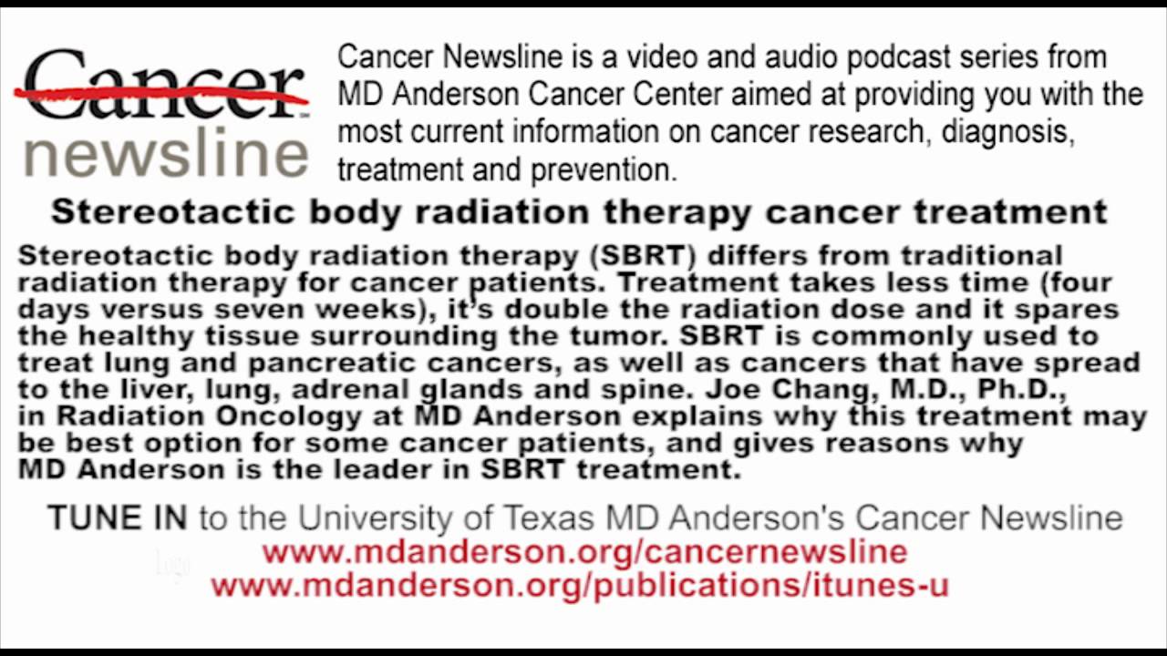 Stereotactic body radiation therapy (SBRT) differs from traditional radiation therapy for cancer patients. Treatment takes less time (four days versus seven weeks), it’s double the radiation dose and it spares the healthy tissue surrounding the tumor. SBRT is commonly used to treat lung and pancreatic cancers, as well as cancers that have spread to the liver, lung, adrenal glands and spine. Joe Chang, M.D., Ph.D., associate professor in Radiation Oncology at MD Anderson Cancer Center, explains why this treatment may be best option for some cancer patients, and gives reasons why MD Anderson is the leader in SBRT treatment.